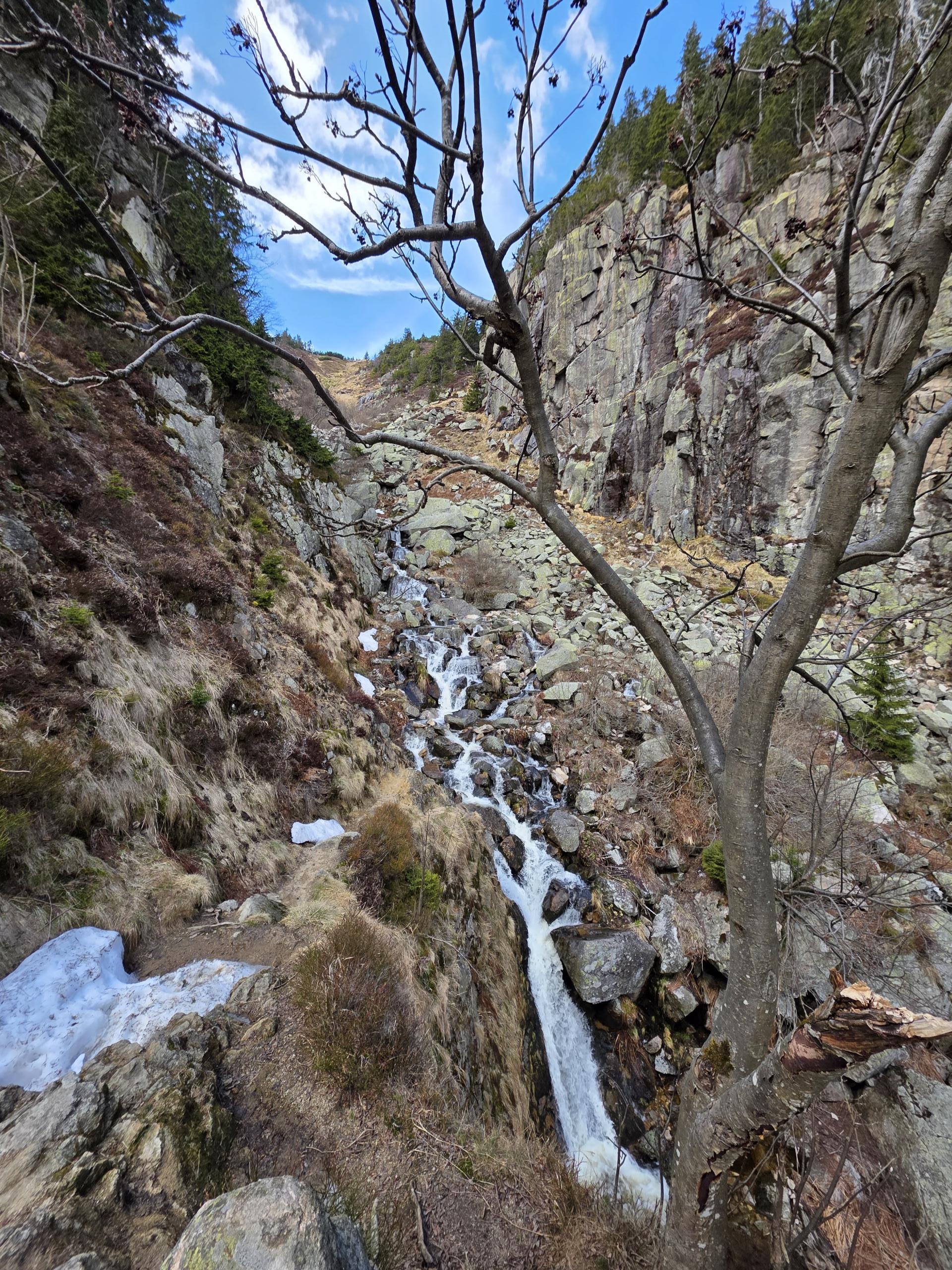 Parkoviště Špindlerovka Pohled od Útulny Petrovy Boudy na Špindlerovu Boudu Dívčí kameny Zdaleka ne jediné místo ještě pod sněhem. Mužské kameny Vysílač Sněžné jámy Čeká na nás polévka a krátký odpočinek. Labský vodopád kameny nebo sníh, dost záběr na nohy Děvět sil bílý Místo pro čůrání, a nebo ne?