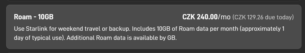 Dnes jsem objevil zajímavou informaci, kterou lze dohledat pouze, pokud jste již klienty starlinku. My jsme. Máme Starlink Mini. Používali jsme jej před dvěma týdny. Bylo to fajn. Zaplatili jsme si tarif Roaming-50GB na jeden měsíc za 1050Kč. Po použití jsme jej zastavili.