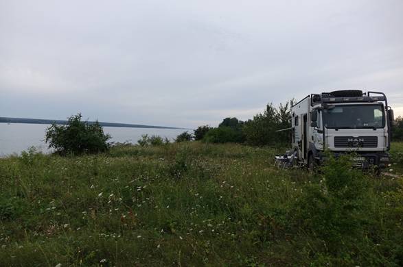 Už sa blížime k civilizovanejším oblastiam, už aj štvorprúdovka, niekde hotová, niekde stavajú. Potom podľa garminu k rieke Kama, prítok Volgy, po krkolomnom zjazde na brehu rieky, zase zmena, už nie lesy. Len taká pre nás bezvýznamná riečka, ale väčšia ako Dunaj. Idylka-romantika, sledovanie lodičiek, bola aj veľká výletná. Tieto večery a to, že sa neponáhľame a včas to zapichneme nás držia stále v hre, napriek neuveriteľným vzdialenostiam. Ak by sme ťahali každý deń do 18-19tej, bolo by to fakt únavné. Je to síce nekonečné, ale takto sa človek vždy teší na príjemný večer a užíva si ho. Tých miest na krásne kempovanie je tu habadej, žiadne zákazy ako u nás, stále nás to baví.