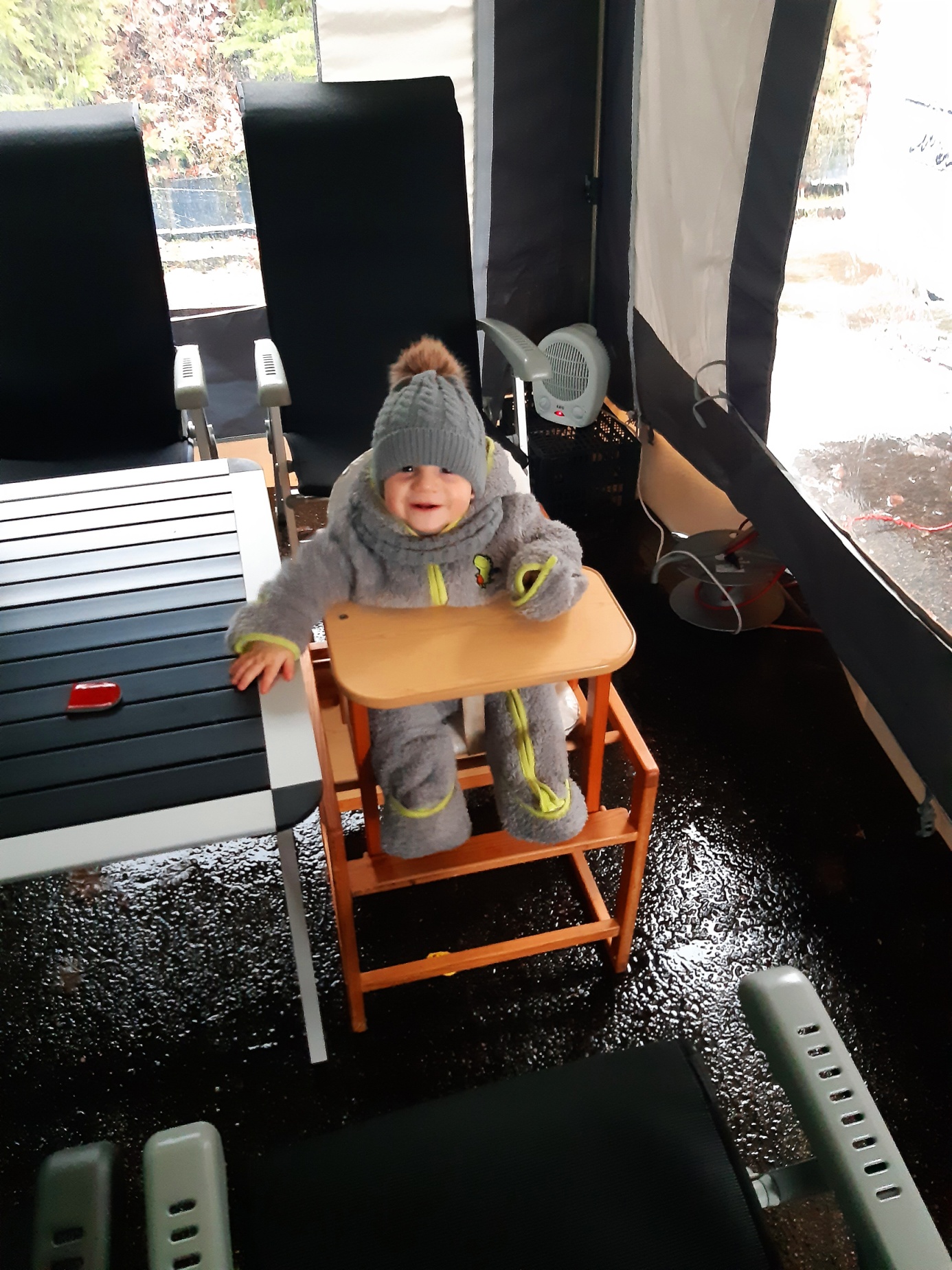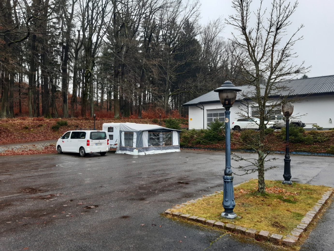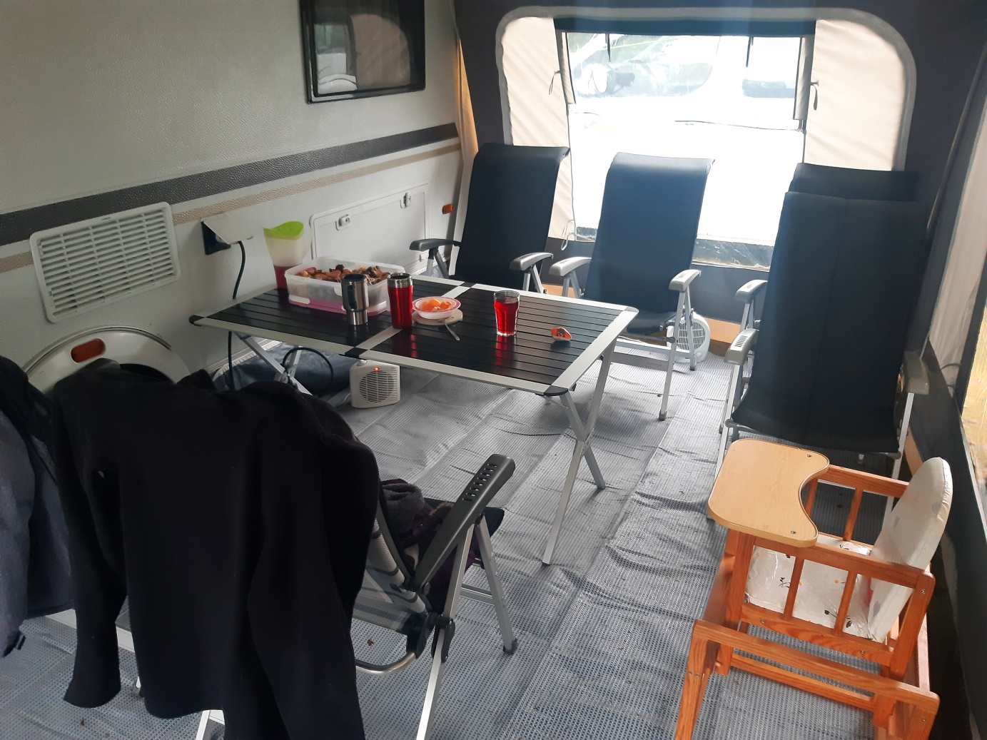 Noc byla větrná, a když nejsou kolíky zatlučené v asfaltu, tak to byla bezesná noc. Ráno konstatujeme, že takto ne a Čert rozhoduje: ,,Balíme a jedeme k lesu!“ Máme to nacvičené a tak během chvilky jsme zase v křesílkách u lesíka. Podklad byl sice mokrý, ale kupodivu se vůbec nebořilo. Asi to bude tím, že jsme na vrcholu vyhaslé sopky….