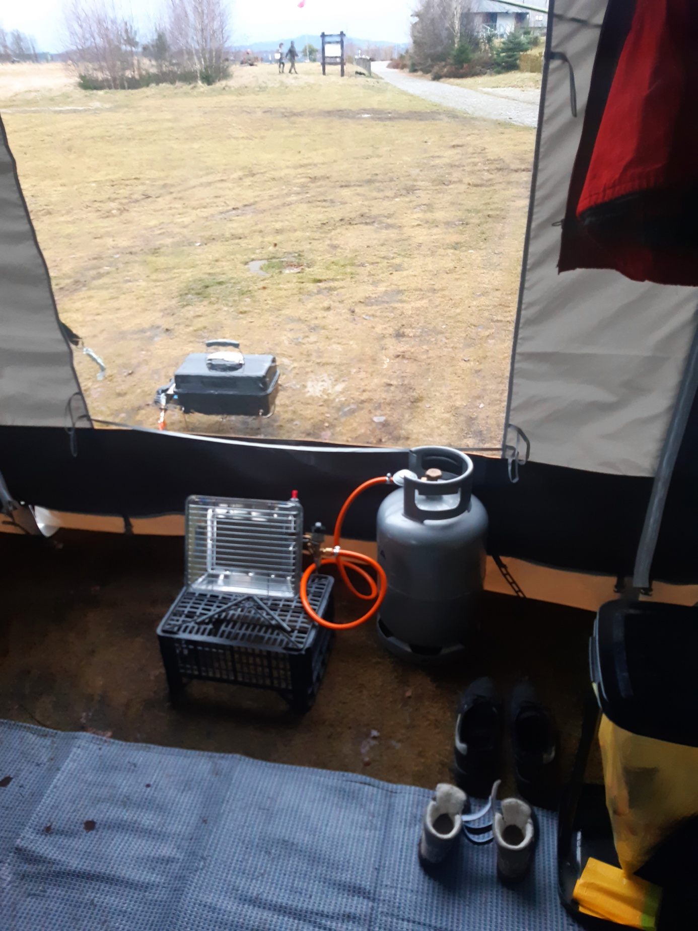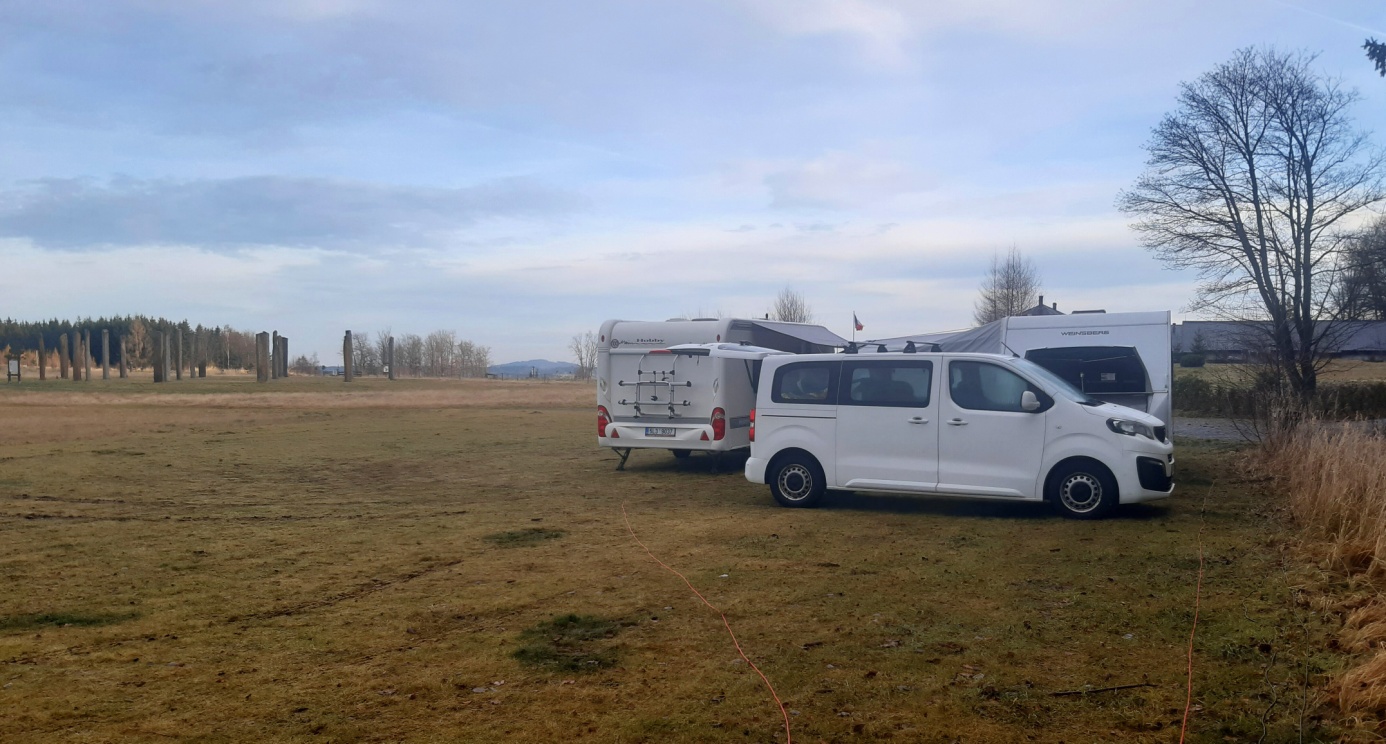 Den D a ráno přes Litoměřice, Nový Bor míříme směr Rumburk. Na Šebru už se blížíme nule a přibývá okolo cesty sněhu. (To ještě netušíme, že to byl poslední letošní sníh co vidíme). Po pár kilometrech jsme zase na cca 5°C. Cesta až na vrcholové parkoviště bez problémů. Pan majitel nám ukazuje místa kde lze parkovat, kde je elektřina i voda. Místo podmáčené trávy volíme asfalt a rychle stavíme předstan, než přijde očekávaný déšť. Dostavíme a opravdu začalo pršet a dokonce i foukat. Ale je 10°C a tak to není hrozné, po sněhu ani památky…