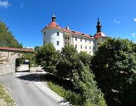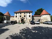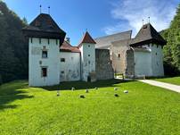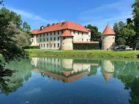 Hrad Otočec je jediný vodní hrad ve Slovinsku, nyní je z něj hotel, ale i prohlídka nádvoří a okolí je moc pěkná. Parkujeme 45.8389794N, 15.2339828E kousek od mostu k hradu.