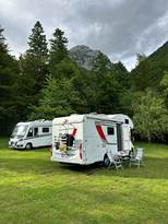 První cesta vedla přes váhu v naší sběrně. Trochu jsem se lekl zvěstí o přísných kontrolách v Rakousku, ale naložené auto se vším pro nás dva ukázalo 3330Kg. (alkovna 6,5m). To mě uklidnilo a tak – hurá na cestu. Vyjíždíme v sobotu 24.5. a plán je zastavit se v Rakousku u jezera Grosesee u Bad Mitterndorf, ale předpověď hlásí mizerné počasí, proto ač nerad pokračuji až k Bledu, kam přijíždíme večer. Zpestřením je cesta přes horský přechod AUT-SLO Wurzenpass. Je to děsný kopec jak nahoru, tak dolu. S malou zastávkou u pramene řeky Sávy 46.4944417N, 13.7339347E (nedá se tam spát) už na Slovinské straně pokračujeme do Bledu.