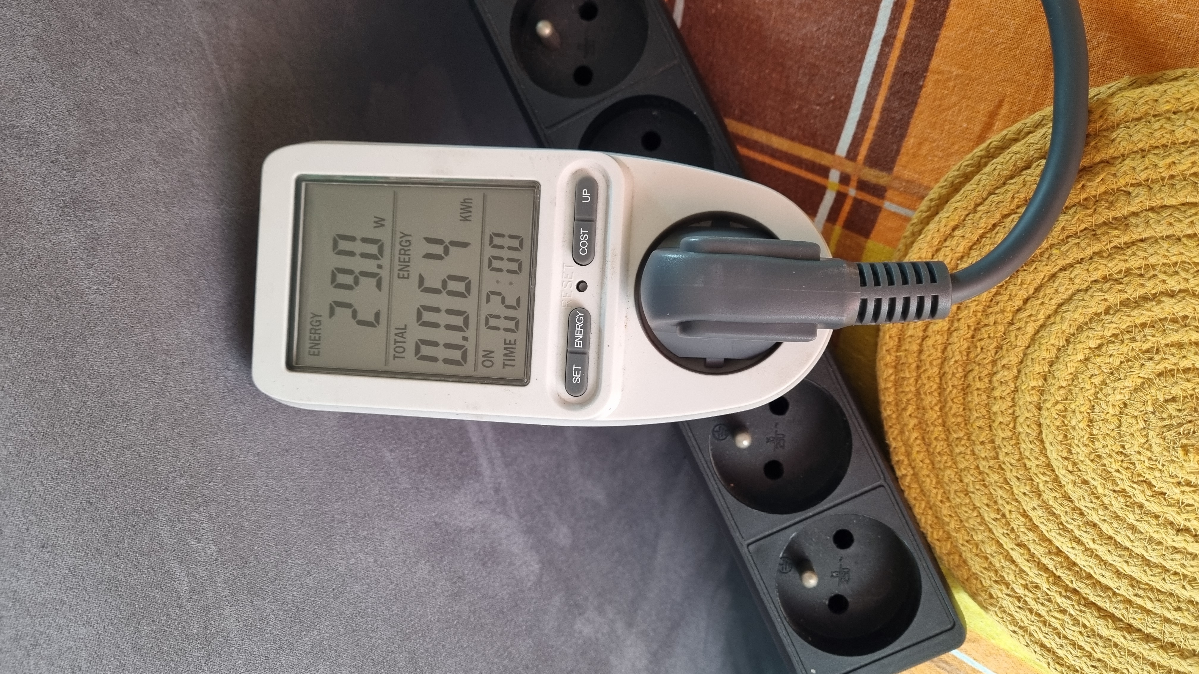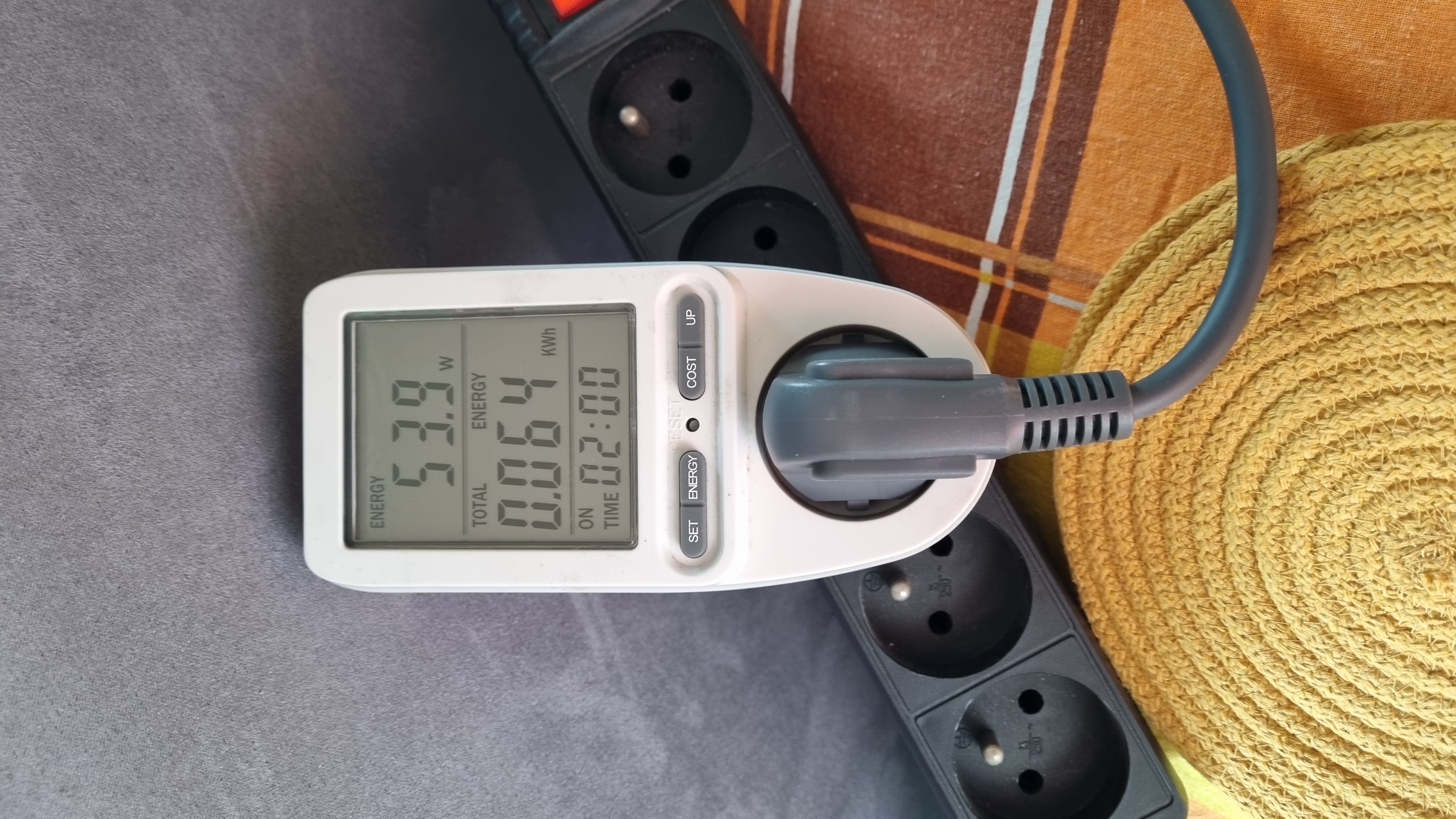 Nechal jsem běžet 2 hodiny, spotřeba se měnila od 29 do 50 W při běžné práci, surfování po internetu, písničky z youtube, vzdálené připojení Teamviever, aktualizace map z Mapy.cz. Měl jsem připojený notebook, tablet a telefon. Celková spotřeba za 2 hodiny byla 64 W.